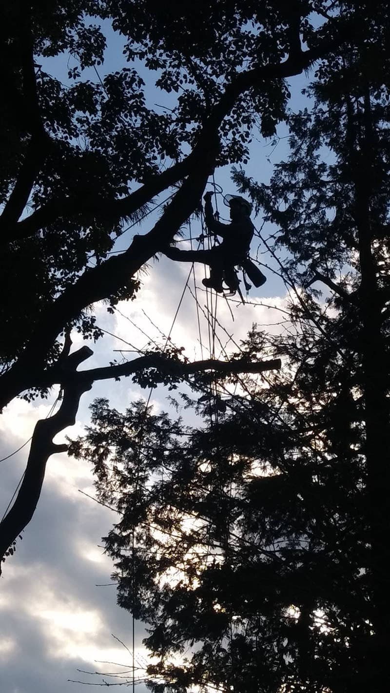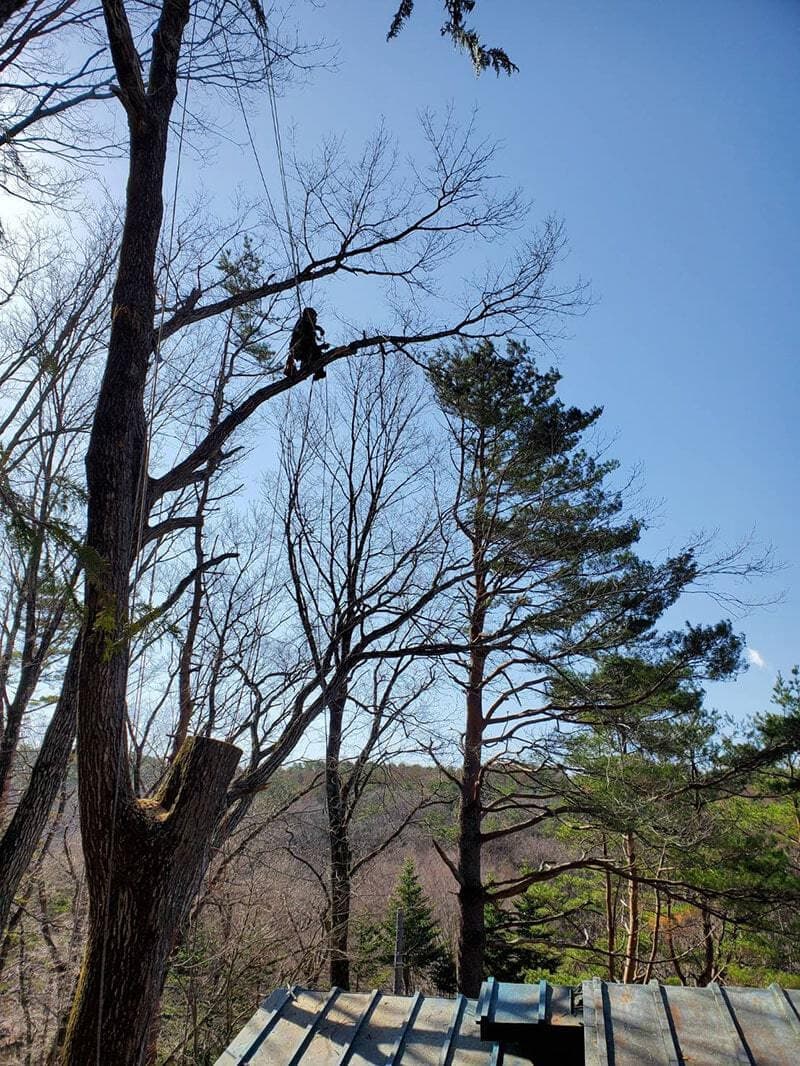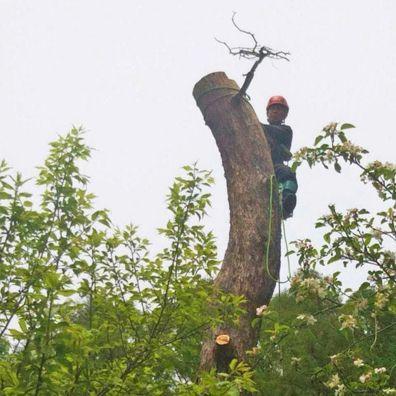 ツリーワークミヤジでは、欧米で使われえてるツリークライミングの技術を使ってロープで木に登りそのまま木を倒せない場所でも安全に木を倒して行きます。大きな巨木を処理したいが木を倒すだけのスペースがない場所や重機の入れない場所の木なども伐採が可能です。